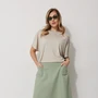 Юбка выполнена из мягкой трикотажной ткани, длиной миди, с отрезным поясом. Изделие застегивается на потайную молнию в среднем шве сзади. Боковые швы декорированы вставкой из контрастного однотонного трикотажа с кантом. Заднее полотнище юбки со средним швом, которое заканчивается разрезом. Длина 77.