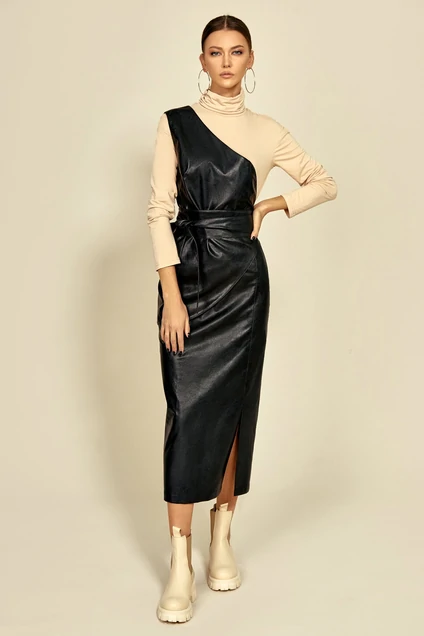 Юбка с высокой талией прилегающего силуэта, длины миди. Передняя часть со швом по левой стороне, в котором обработан разрез. Задняя часть цельнокроеная с талиевыми вытачками. В боковом шве застежка на потайную молнию. В комплекте съемный пояс из основной ткани. Длина 90 см.