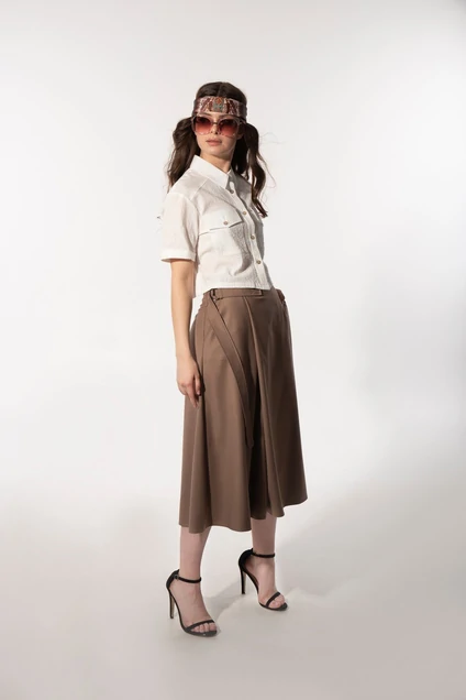 Юбка из лёгкой костюмной ткани без подкладки. Спинка с центральным швом и застёжкой на потайную молнию. Длина по спинке 76 см. Перед со складкой, направленной к боковому шву. В боковых швах функциональные карманы. Декоративный пояс по переду фиксируется двумя полукольцами. Длина 76 см