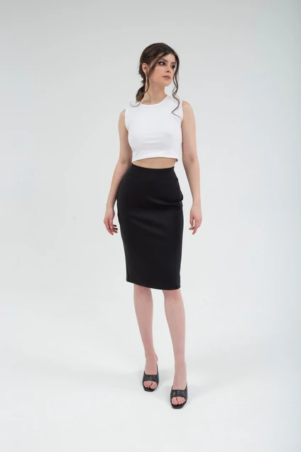 Юбка из плотного бандажного трикотажа , прекрасно облегает и подтягивает фигуру, по центру спинки шов и разрез.верх юбки обтачен широкой резинкой. Длина юбки 62 см
