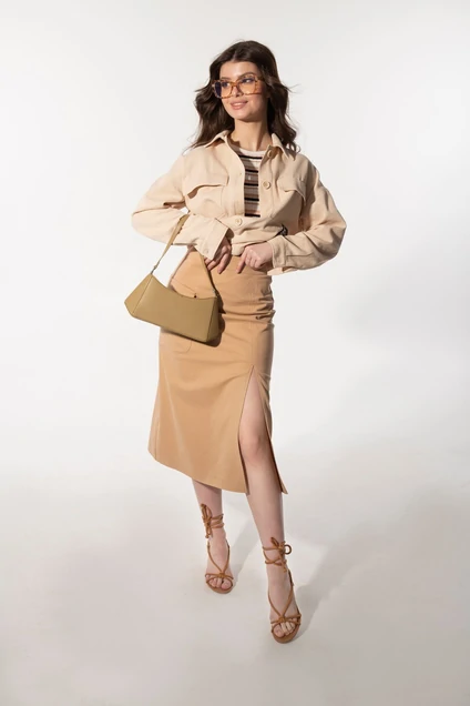 Хлопковая юбка слегка расширенного силуэта. Спинка с центральным швом и застёжкой на потайную молнию. По переду высокий разрез на левой половинке. На правой половинке настрочен акцентный накладной карман с клапаном. Длина 72 см