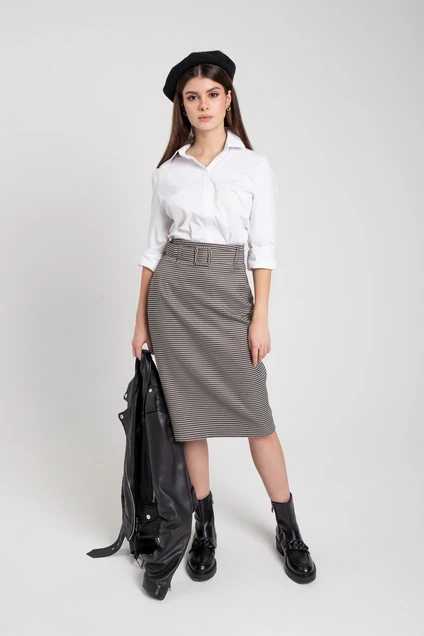 Юбка классическая, прямого силуэта, на подкладке. Изделие с завышенной линией талии. Заднее полотнище с центральным швом и вытачками. Застёжка на потайную молнию, по низу шлица. На широкой кокетке настрочены шлёвки, в которые втянут пояс из основной ткани с обтяжной пряжкой. Длина изделия 66 см.