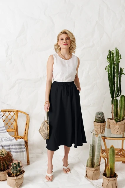 Юбка - солнце, самая женственная модель этого лета. Пояс юбки на резинке с вставленным внутрь шнурком для удобства регулировки облегания по талии. По переду расположены карманы с наклонным входом.