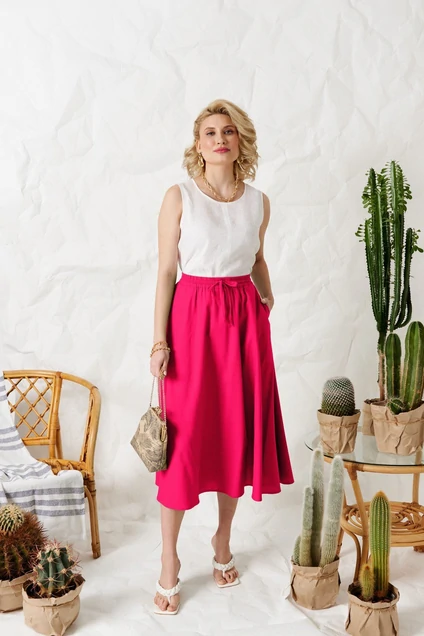 Юбка - солнце, самая женственная модель этого лета. Пояс юбки на резинке с вставленным внутрь шнурком для удобства регулировки облегания по талии. По переду расположены карманы с наклонным входом.
