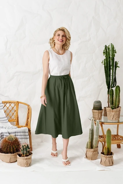 Юбка - солнце, самая женственная модель этого лета. Пояс юбки на резинке с вставленным внутрь шнурком для удобства регулировки облегания по талии. По переду расположены карманы с наклонным входом.