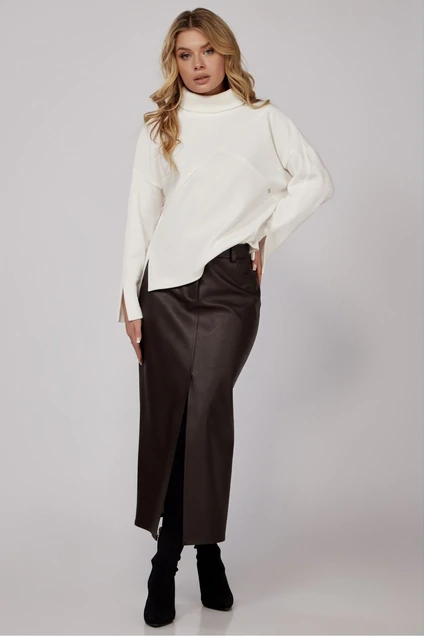 Юбка на талии, плотно облегающая вверху и прямая к низу, длиной до середины икр, с притачным поясом. Застежка на тесьму-молнию и 1 кнопку. Переднее полотнище юбки со средним швом, который заканчивается разрезом, в боковых швах обработаны карманы фигурной формы. Заднее полотнище юбки со средним швом и с кокетками.