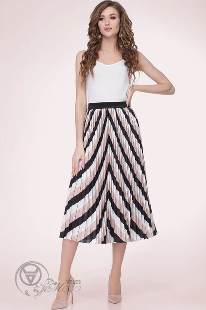 Юбка-плиссе длины миди делает женский образ изысканным. Она словно говорит: Моя обладательница непохожа на других, умеет любить и баловать себя роскошными вещами. Плиссированные юбки добавляют элегантности в любой look, эффектно сочетаясь с верхом и обувью разного стиля. В 2018-2019 году, с легкой руки Дома Гуччи, плиссировка стала одним из ведущих трендов. Юбка-плиссе из шифона в орнамент, легкого и шелковистого на ощупь. Углы плиссировки подчеркнуты тонкой черной полоской. Юбка на подкладке из белого трикотажа, по талии на резинке с люрексом, без застежки. На фото юбка с рубашкой м.12931 рр.44-54, с джемпером м.11852 рр.44-54, с жакетом м.11927 бежевый рр.44-54.