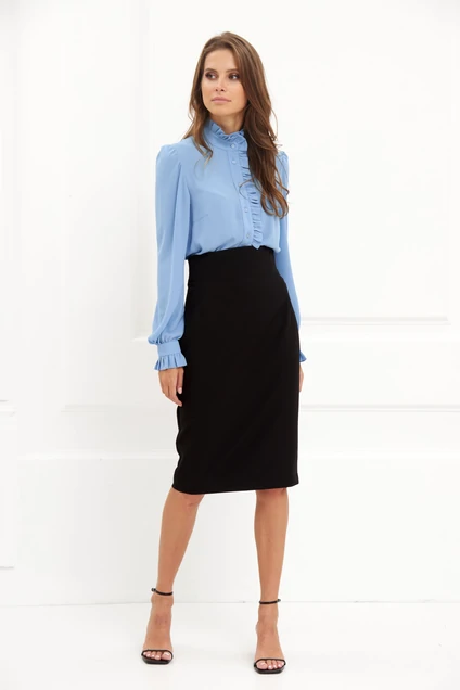 Юбка-карандаш с высокой посадкой классической длины за колено. Сзади шлица, вытачки и потайная застежка на молнию.