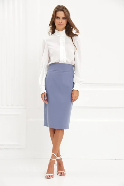 Юбка-карандаш с высокой посадкой классической длины за колено. Сзади шлица, вытачки и потайная застежка на молнию.