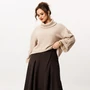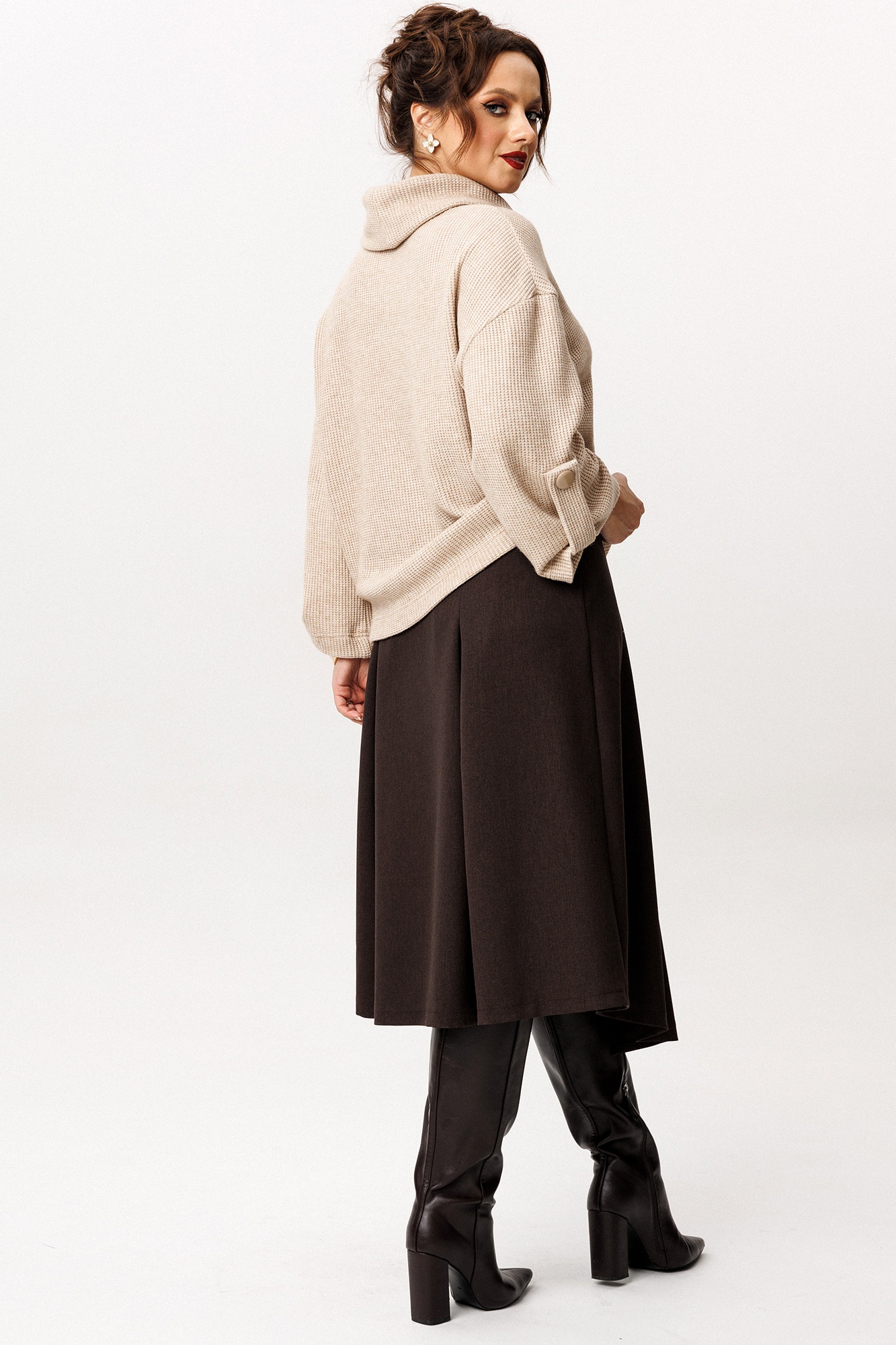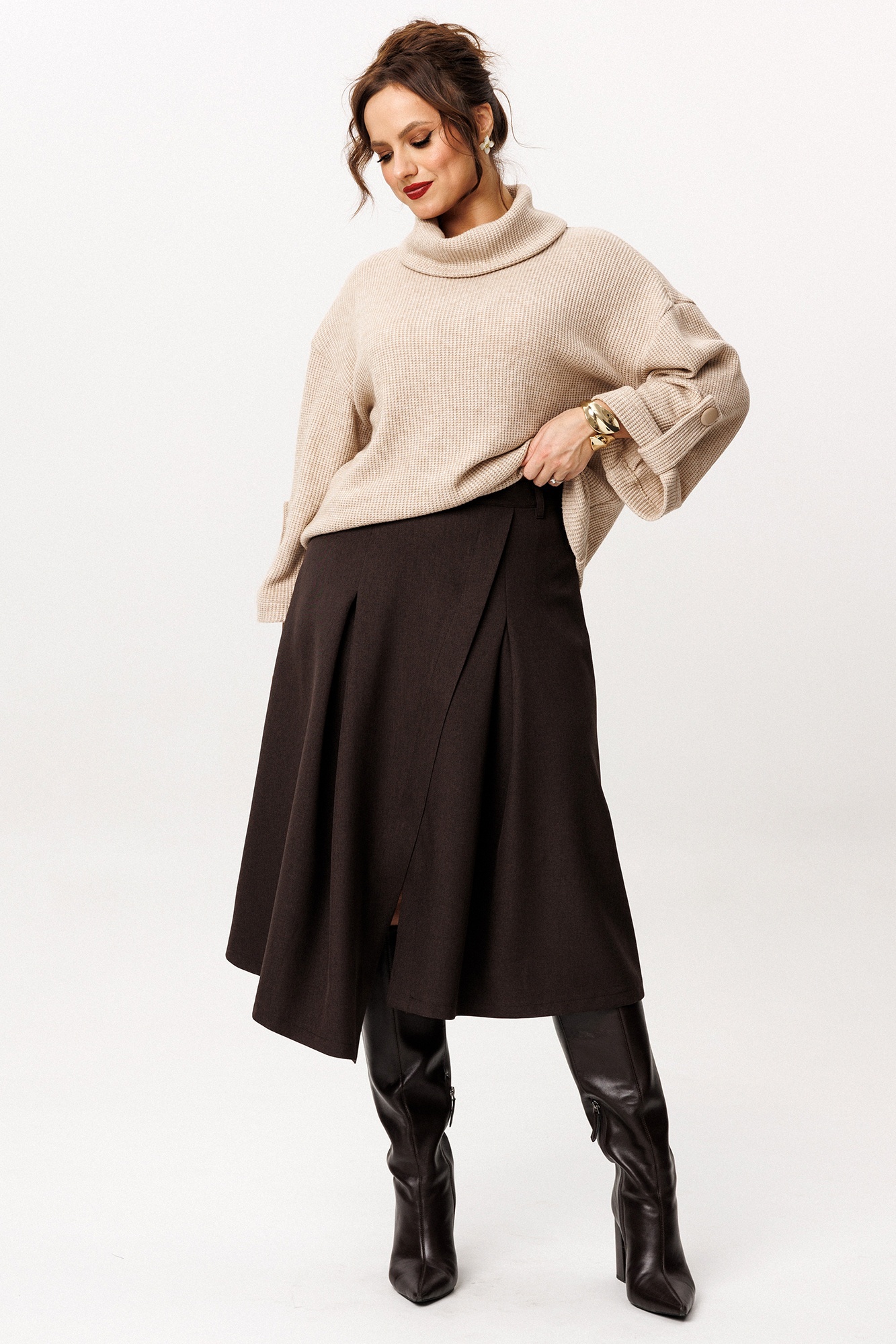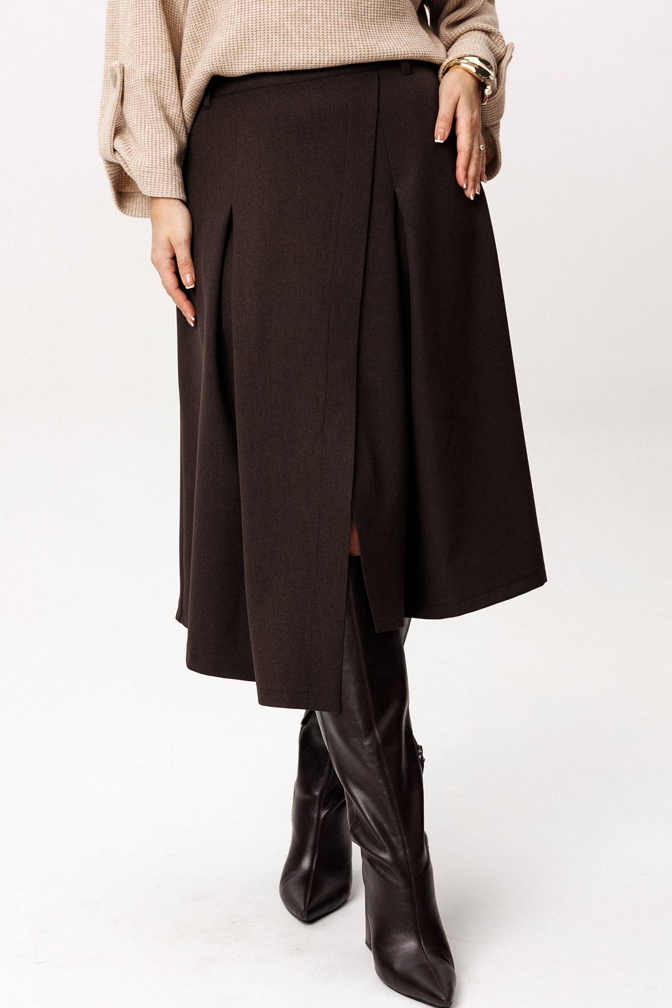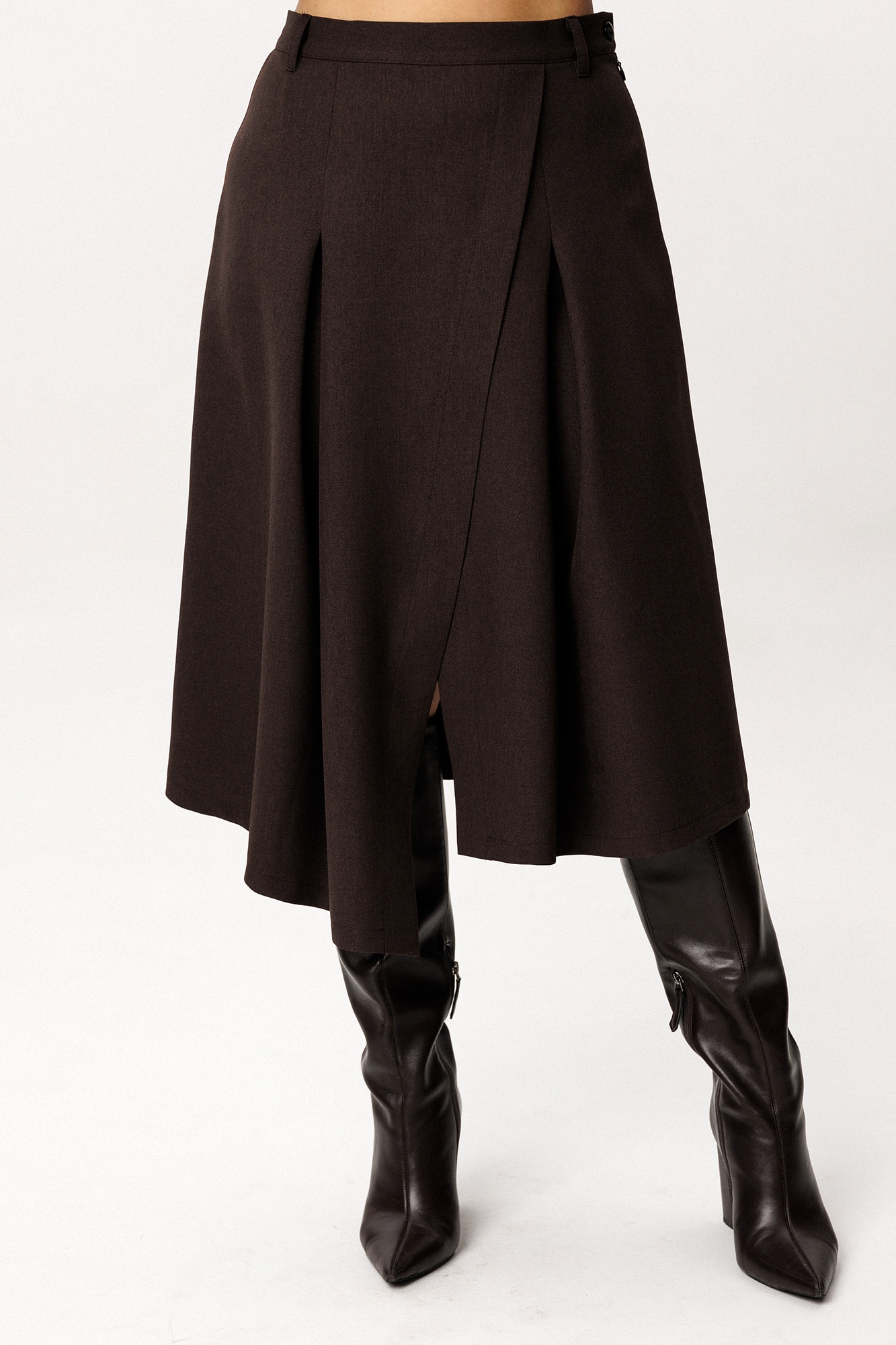 Юбка А-силуэта. По переду и по задней половинке встречные складки. Перед юбки ассиметричный. В боковой шов вставлена потайная молния. Верх юбки обработан притачным поясом со шлёвками, который застёгивается на петлю и пуговицу.