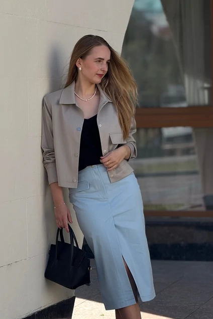 Юбка-карандаш голубого цвета – это воплощение элегантности и стиля. Приталенный крой и вытачки идеально подчеркивают фигуру, а разрез спереди добавляет нотку игривости. Легкая дышащая подкладка обеспечивает комфорт на протяжении всего дня.
