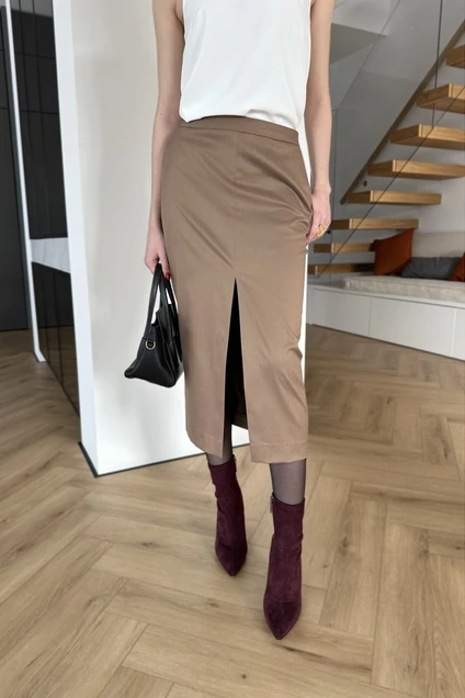 Коричневая юбка-миди — универсальная модель вне времени и трендов. Посадка ниже линии талии и с разрезом спереди. Юбка с подкладкой. Рекомедуем комбинировать с жакетов полуприталенного кроя из новой коллекции.