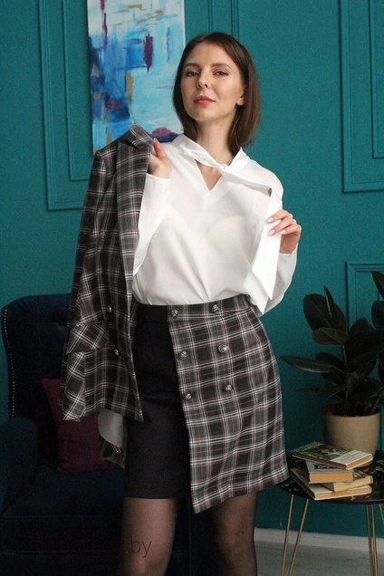 Юбка из костюмной шерстяной ткани на подкладке. Модель с имитацией запаха выполнена из комбинированных по цвету тканей. Юбка декорирована крупными пуговицами. В боковом шве потайная застежка-молния. Эта модель смотрится оригинально и подчеркивает стройность фигуры.