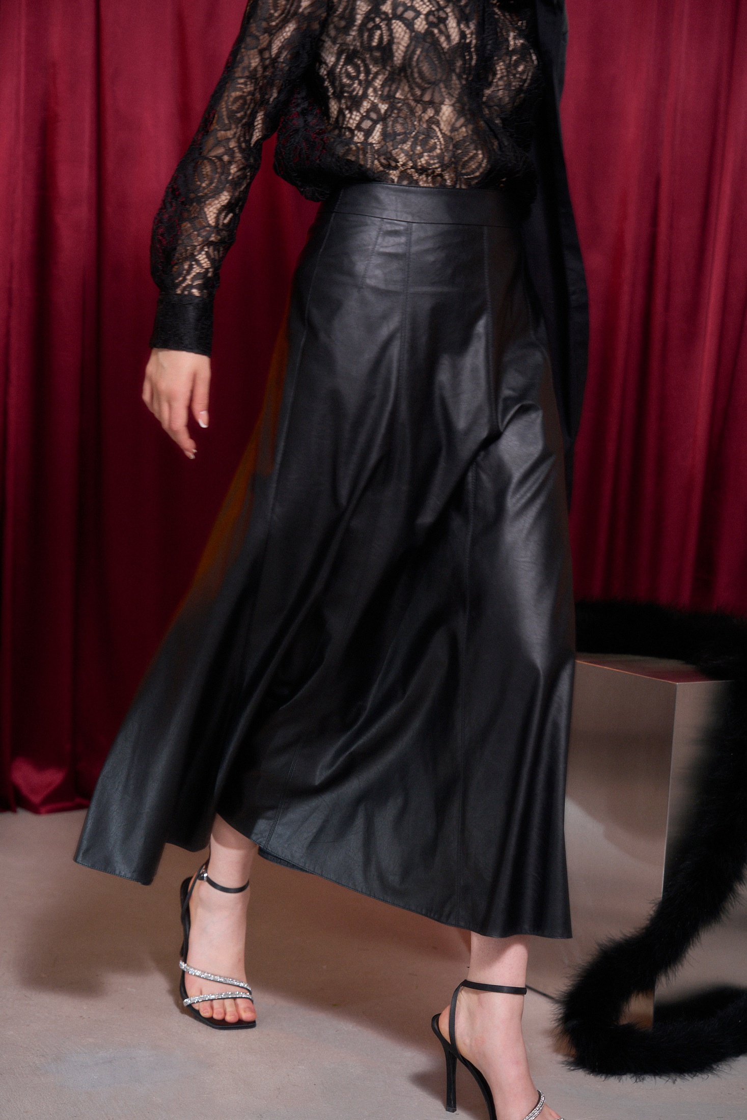 Юбка на притачном поясе, на подкладке. В боковом шве застежка на потайную молнию. По переду и спинке рельефы.