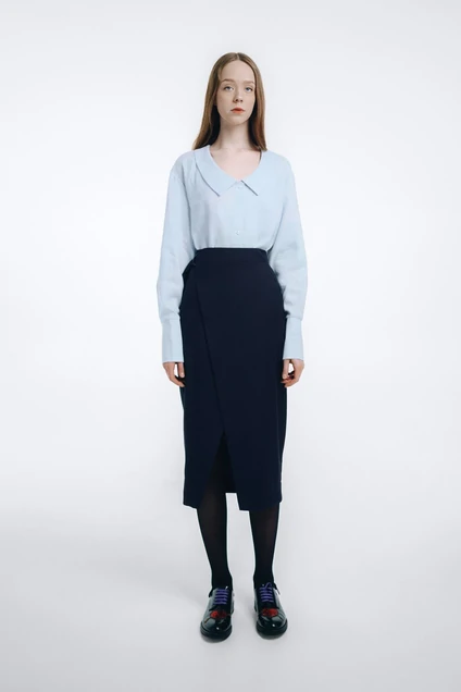 Акцент этой лаконичной юбки — высокий разрез с боку, который деликатно приоткрывает ногу. Чтобы добиться такой динамики, юбку сшили из плотной, но тонкой шерсти Австралийского мериноса, произведенной на фабрике в Беларуси.