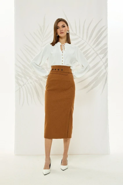 Юбка прямого силуэта, на притачном поясе, без подкладки. Переднее полотнище с талиевыми вытачками и декоративным вертикальным подрезом с планкой, переходящим в разрез. Заднее полотнище с талиевыми вытачками и средним швом. В среднем шве застежка на молнию. В комплекте съемный пояс на кнопках. Длина юбки: 81 см