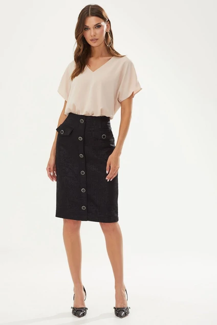 Классическая юбка-карандаш из костюмной ткани в стиле’’ шанель”. По переду декоративная планка и клапаны с пуговицами. По переду и спинке вытачки. По спинке в среднем шве потайная молния, по низу - разрез. Юбка на обтачке с подкладкой. Обращаем ваше внимание, что фурнитура может незначительно отличаться от фото. Длина изделия:(63см -44-48р);