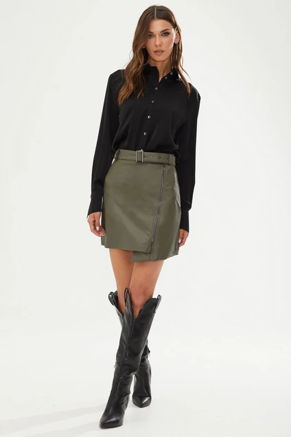 Стильная юбка-мини А-образного силута из экокожи на хлопковой основе. По верху юбки притачной пояс. По переду имитация запаха с застежкой на декоративную молнию. В боковом шве потайная молния. По спинке вытачки. В комплект входит съемный пояс. Обращаем ваше внимание, что фурнитура может незначительно отличаться от фото. Длина изделия: (39см + пояс 4,5см -42-46р) (43см + пояс 4,5см 48-52р)
