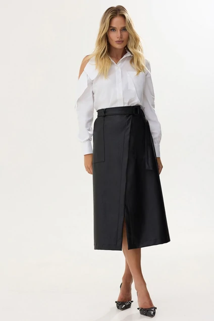 Стильная юбка на запах расширенная книзу из экокожи на хлопковой основе. По верху юбка на притачном поясе со шлевками, по спинке центральная застежка на молнию. Правое полотнище юбки формирует запах. По переду накладные карманы. С 50р в пояс спинки вставлена резинка. В комплект входит съемный пояс. Юбка без подкладки. Длина изделия: (44-54р - 80см +4см )