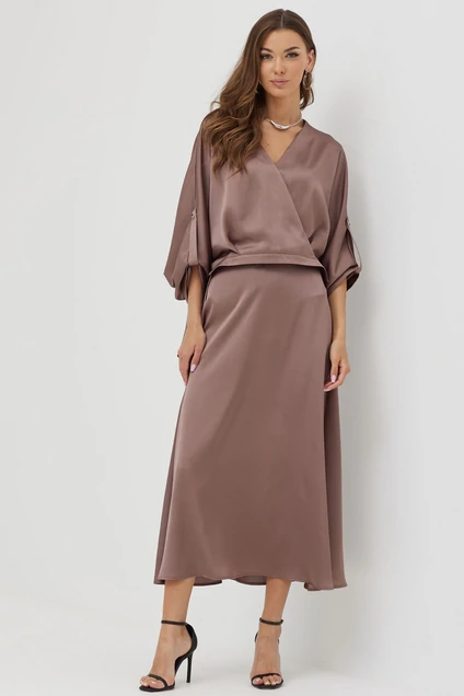 Юбка полуприлегающего силуэта расширенная книзу из струящейся ткани. По верху юбки притачной пояс. В левом боковом шве потайная молния. Длина юбки 86см +пояс