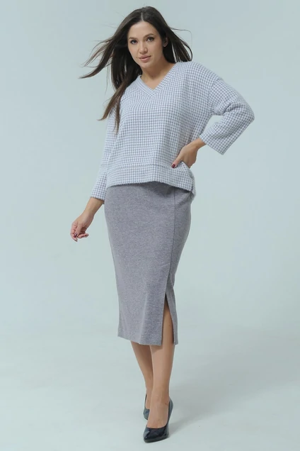 Юбка будет идеально смотреться с нашим ждемпером 1059 (на фото) или оба изделия можно купить костюмом 3030.