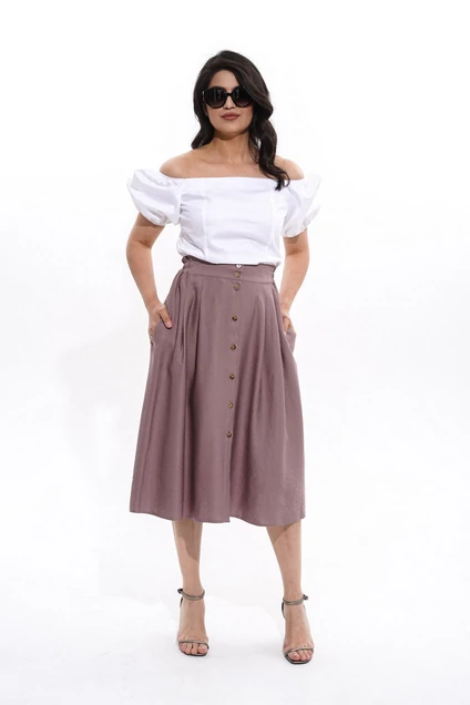 Юбка свободного кроя, трапециевидного силуэта, со складками, длина миди, без подкладки. Впереди на пуговицах с планкой вдоль всего изделия. Втачной пояс на пуговице, по бокам на резинке. В боковых швах карманы. Длина изделия - 79 см.