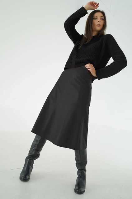 Юбка - трапеция из эко - кожи на подкладке. Пояс на обтачке. Перед юбки с центральным швом и отрезной деталью по низу переда и спинки. Застежка молния в среднем шве спинки.