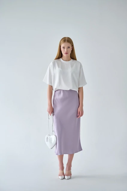 Юбка миди из шелковистой ткани - незаменимый предмет гардероба. Это один из универсальных вариантов, который подходит как для торжественного мероприятия, так и для повседневной жизни. Актуальный крой "по косой" позволяет юбке струиться, обеспечивает идеальную посадку по фигуре и невероятно стройнит. Для удобства в использовании по талии предусмотрена резинка шириной 3 см. Она потайная, пришита с изнаночной стороны, что позволяет, не испортив внешний вид, обеспечить отличную фиксацию по талии. Особого шика добавляет благородный приглушенный блеск ткани атласного переплетения.