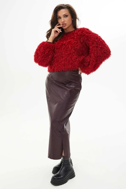 Юбка макси из экокожи с цельнокройным поясом. По переду рельефы, заканчивающиеся шлицами. Боковая верхняя часть с отрезной кокеткой и настроченными боковыми карманами. Задняя часть юбки со средним швом. Застежка на молнию в боковом шве. Юбка без подкладки.