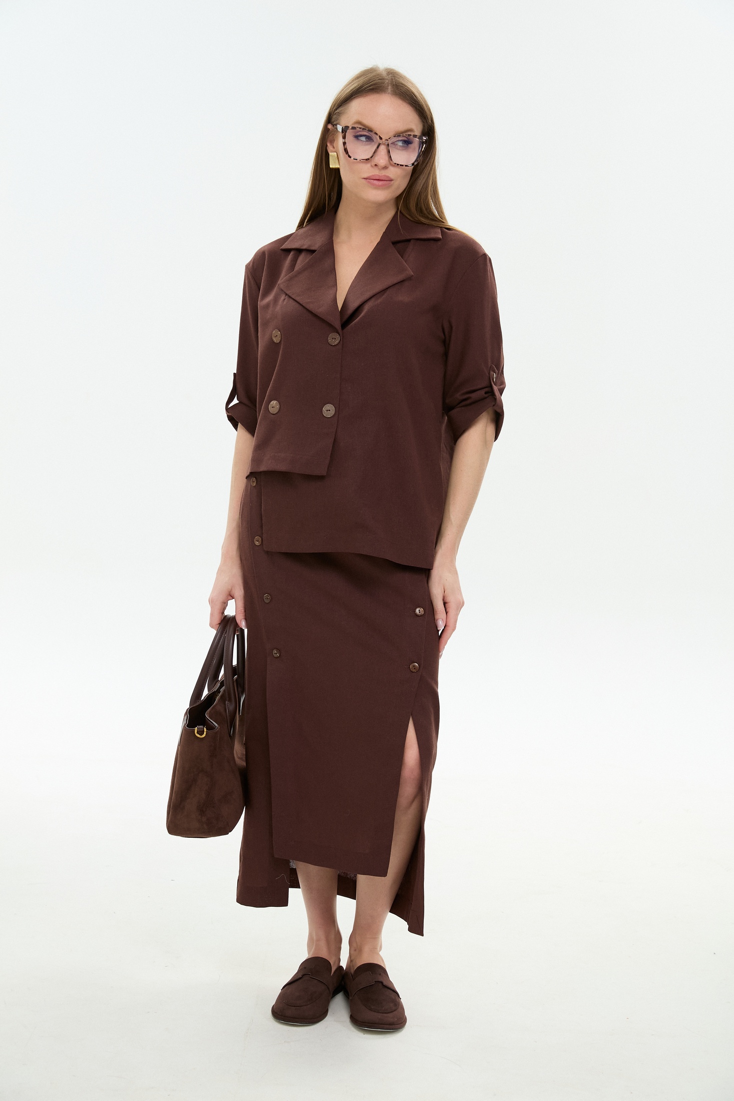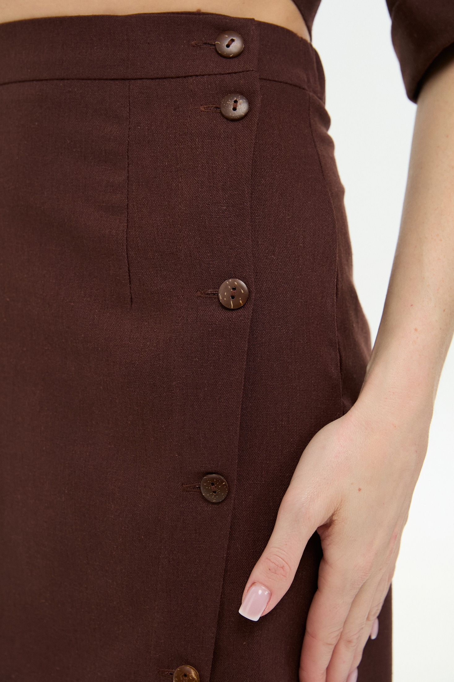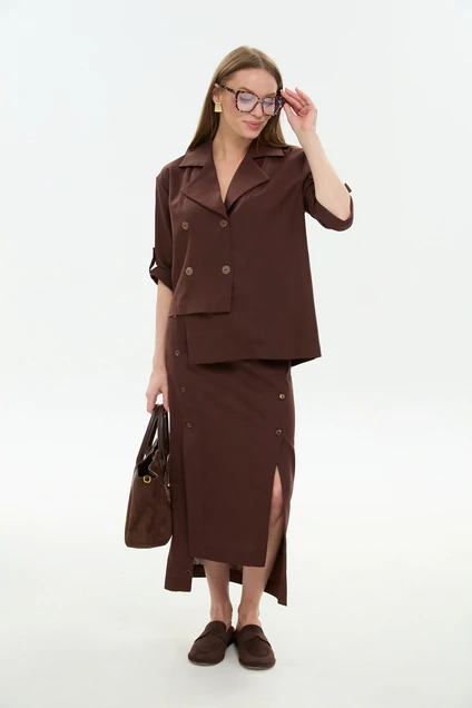 Юбка 971-6 шоколад NikVa станет отличным выбором для летнего гардероба. Коллекция бренда NikVa предлагает миди-юбку расклешенного фасона с асимметричным низом, выполненную из комбинации льна, вискозы и хлопка. Благодаря притачному поясу и резинке на спинке, изделие комфортно сидит на фигуре. Передняя часть включает декоративную строчку и кнопки, а боковые карманы добавляют практичности. Шоколадный цвет юбки отлично подойдет для повседневных и офисных образов. Средний шов и вытачки на спинке обеспечивают идеальную посадку.