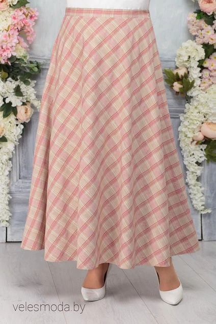 Юбка женская, в клетку, покроенная по косому, расширенная к низу, на подкладке. Модель на притачном поясе, с внутренней резинкой сзади и с застёжкой на петлю пуговицу сбоку слева. Длина по боковому шву 95,0 см. от шва притачивания пояса. В левом боковом шве обработана застёжка на потайную тесьму молнию.