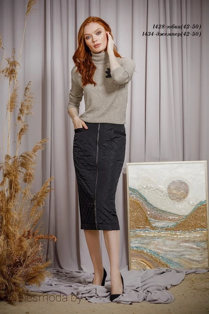 Юбка длиной ниже линии колена, отлично сочетается как с джемперами, так и с элегантными блузами и классическими рубахами. Юбка прямая, немного зауженная книзу. По переду - декоративный подрез, в котором выполнены прорезные карманы из отделочной ткани. Застежка на молнию спереди. Задняя половинка юбки выполнена из плотного трикотажа с нейлоном, что позволяет прекрасно сидеть на фигуре. Подкладка передней половинки- 100% вискоза. Она простегана вместе с верхом изделия.