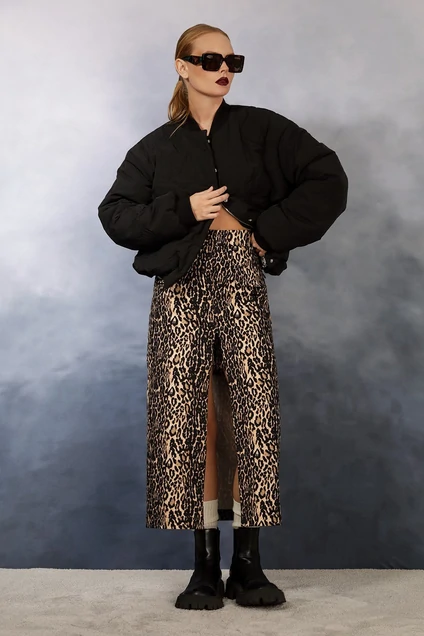 Юбка А- образного силуэта. Спереди высокий разрез, имитация застежки и декоративные клапаны , сзади средний шов. Изделие на широком поясе-кокетке со шлевками. Застежка на молнию сбоку. Изделие без подкладки. Снизу притачные короткие шорты.
