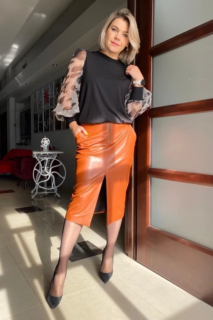 Юбка из экокожи в модном цвете обожжённого красного кирпича.