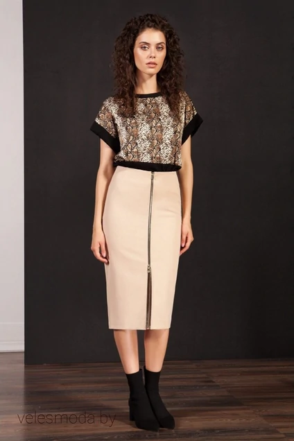 Женская юбка-карандаш из стрейчевой костюмной ткани длиной ниже колена с высокой посадкой на талии. Застёжкой служит металлическая молния по центральной части юбки спереди.