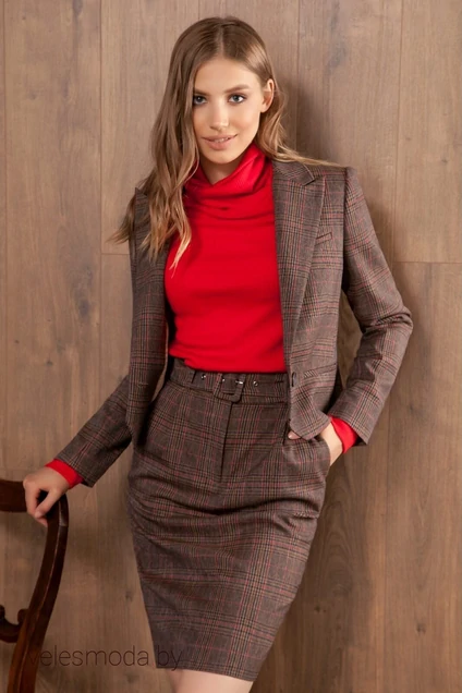 Юбка из костюмной ткани с содержанием вискозы с дизайном в клетку, длиной выше колена, зауженная к низу. Юбка на притачном поясе с боковыми наклонными карманами. Застежка в среднем шве переда на потайные крючки и молнию. Сзади юбка со средним швом и шлицей по низу. Дополнением служит пояс с обтянутой пряжкой из основной ткани.