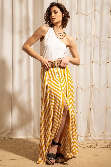 Юбка с вискозной ткани в полоску с кокеткой. По переду застежка-планка на пуговицы, рельефы с отделочной строчкой. По заднему полотнищу средний шов с рельефами и отделочной строчкой. Притачной пояс со шлевками дополнен съемным поясом.