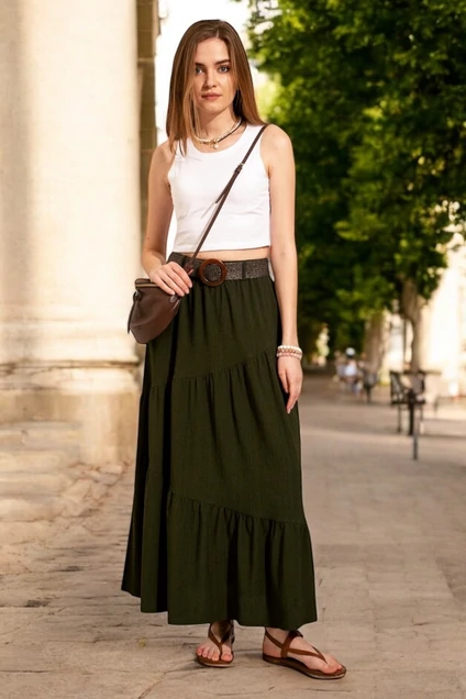 Эта стильная макси-юбка тёмно-зелёного цвета станет универсальным элементом вашего гардероба. Модель выполнена с оригинальными диагональными подрезами и изящной сборкой, что добавляет объём и динамику образу. Юбка дополнена боковыми разрезами внизу, подчёркивающими лёгкость и изысканность фасона. Это идеальный вариант для создания как повседневных, так и вечерних ансамблей.