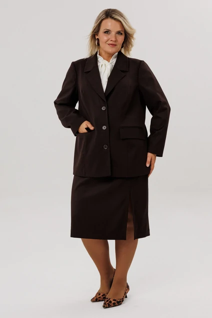 Юбка без подкладки, классическая, правильной длины миди, из стрейчевой ткани, свободного покроя, с аккуратным разрезом на ноге. Пояс юбки на широкой резинке, сбоку молния и петля-пуговица. Ткань хорошо тянется и это позволяет вам комфортно себя чувствовать.