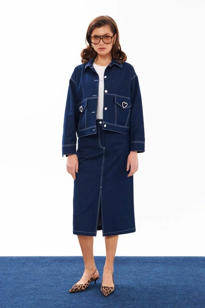 Юбка женская из смесовой джинсовой ткани для повседневной носки. Юбка чуть расширена к низу. Верхний срез юбки обработан притачным поясом. Застёжка в юбке на одну обметанную петли и одну пуговицу, а также в среднем шве юбки имеется застежка-молния. Переднее полотнище юбки имеет два кармана с подкройным бочком, а также со средним швом и вырезом в шве. Заднее полотнище юбки имеет два накладных кармана и средний шов. На поясе располагаются шлёвки, что дает возможность носить юбку под ремень. В юбке имеются декоративные строчки по застежке, среднему шву, поясу, карманам и небольшая строчка по боковому шву. В данной юбке вы обязательно будете чувствовать себя красивой и очень уверенной.