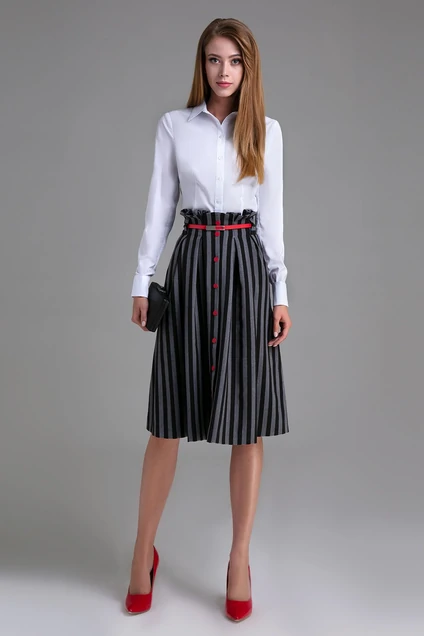 Стильная и очень эффектная юбка самого модного в этом году силуэта,так выгодно подчёркивающего фигуру.Вертикальное направление полосы в изделии очень стройнит фигуру. Сверху юбка образует глубокие фиксированные складки.На уровне талии по бокам выполнены широкие и длинные притачные паты,через которые продёргивается яркий красный пояс.В боковых швах выполнены внутренние удобные карманы.Спереди юбка распашная и застёгивается на красные кнопки. Эта юбка будет служить прекрасным эффектным дополнением к дресс коду стильной и энергичной девушки,которая хочет и умеет произвести прекрасное впечатление на окружающих.
