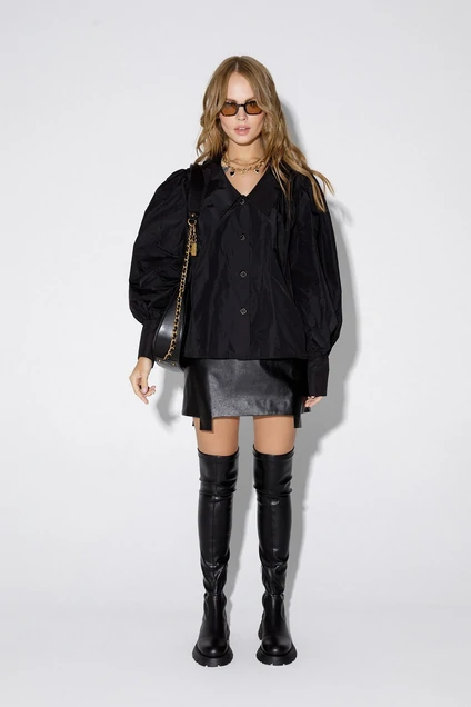 Мини-юбка из экокожи. Детали: высокая посадка, талиевые вытачки, без пояса, потайная застежка в среднем шве спинки, фигурный низ, на подкладке