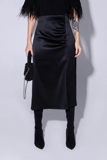 Асимметричной юбка с драпировкой и высоким разрезом из атласной ткани с дизайном. Детали: юбка длины миди, асимметричный крой, перед с высоким разрезом и драпировкой, пояс на обтачках, потайная застежка в среднем шве спинки.