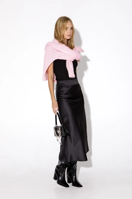 Атласная юбка длины миди. Детали: юбка с высокой посадкой на притачном поясе, потайная застежка в боковом шве, трикотажная подкладка.