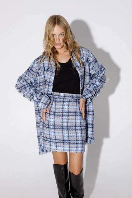 Мини-юбка с высокой посадкой из текстильной ткани в клетку. Детали: юбка на притачном поясе, застежка сзади на потайную молнию, юбка на подкладке.
