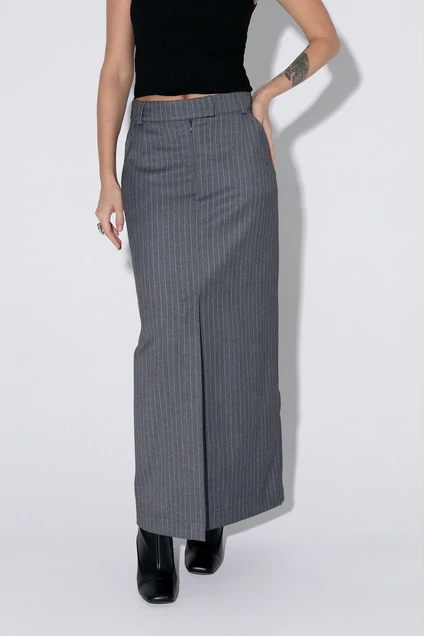 Прямая макси-юбка с высоким разрезом из текстильной ткани в тонкую полоску.