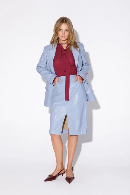 Прямая юбка «карандаш» из экокожи с высоким разрезом.