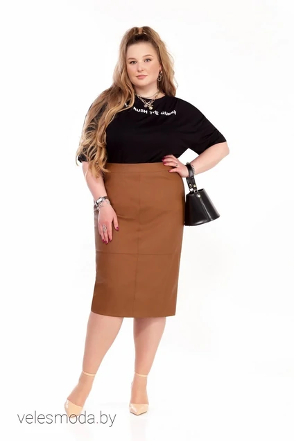 Юбка зауженного к низу силуэта, длиной до середины икры. Юбка на подкрайном поясе. Передняя часть со средним швом. Также по переду есть горизонтальный подрез. Швы с отделочной строчкой. Задняя часть юбки со средним швом, в котором располагается застежка на тесьму-молнию, а по низу шва есть разрез для удобства. Длина изделия по боковому шву от верха 76 см.
