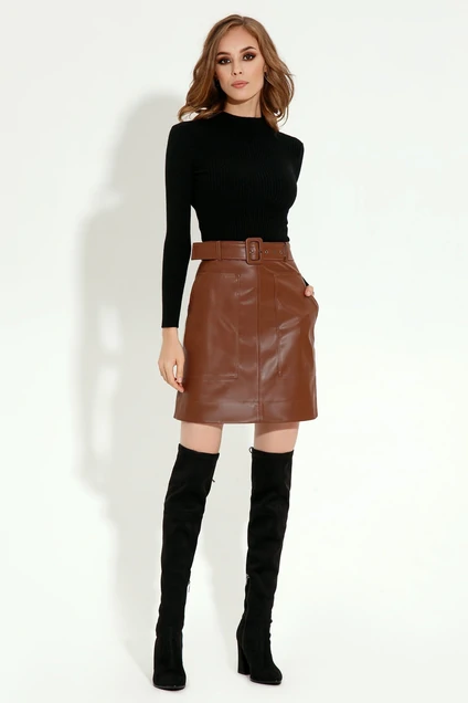 Трендом этого сезона является кожа. Эффектная юбка трапециевидного силуэта, юбка на талии прилегающая к низу расширенная, со средним швом и двумя боковыми, накладными карманами , в боковом шве тесьма- молния, с поясом по линии талии из основной ткани " кожа", отлично сочетается с блузами, рубашками и гольфами.