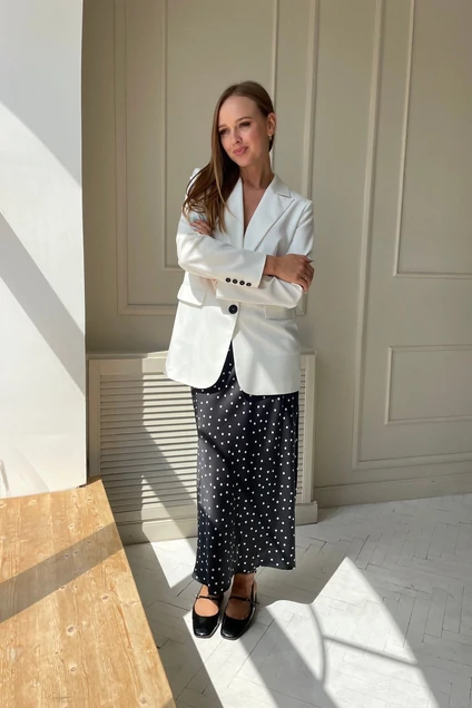 Юбка из гладкой ткани (плательный сатин), силуэт полуприлегающий, расклешенная к низу. Юбка застегивается на потайную молнию сбоку. Длина 89 см